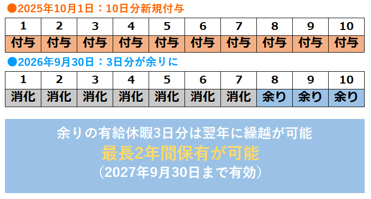 例えば、2025年4月1日に入社した正社員が出勤率8割以上を満たすと、6ヵ月後の2025年10月1日に10日の有給休暇が付与されます。この10日は翌年2026年9月30日までが取得期限ですが、期間内に使いきれなかった分は翌年度へ繰り越され、最長で2027年9月30日まで使用できます。